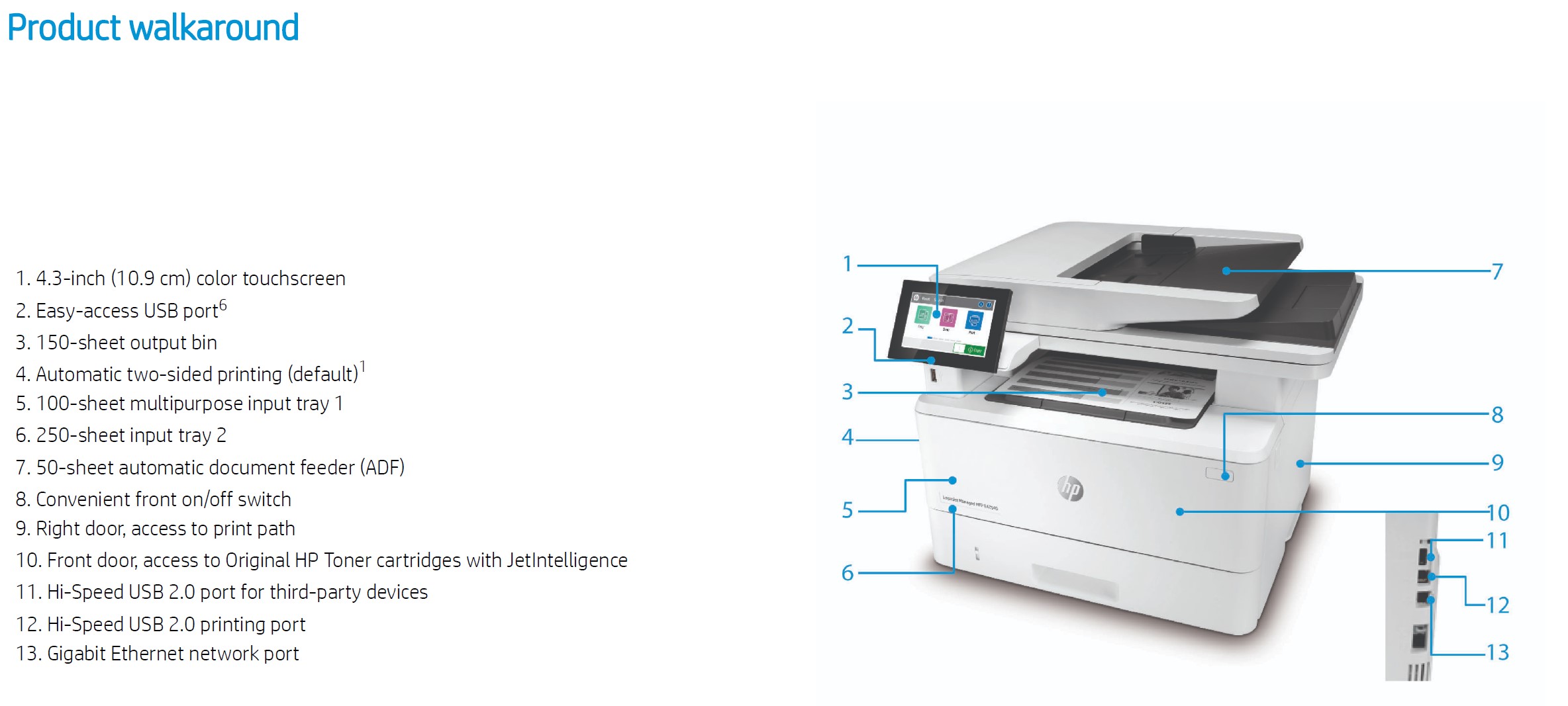 2 Measured using ISO/IEC 24734 Office Suite and Feature Tests, excludes first set of test documents. For more information, see hp.com/go/printerclaims. Exact speed varies depending on the system configuration, software application, driver, document complexity, media size, media orientation, and media type. HP High Speed may require firmware upgrade to enable.