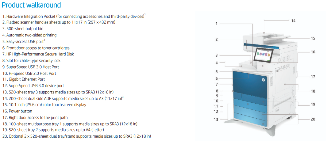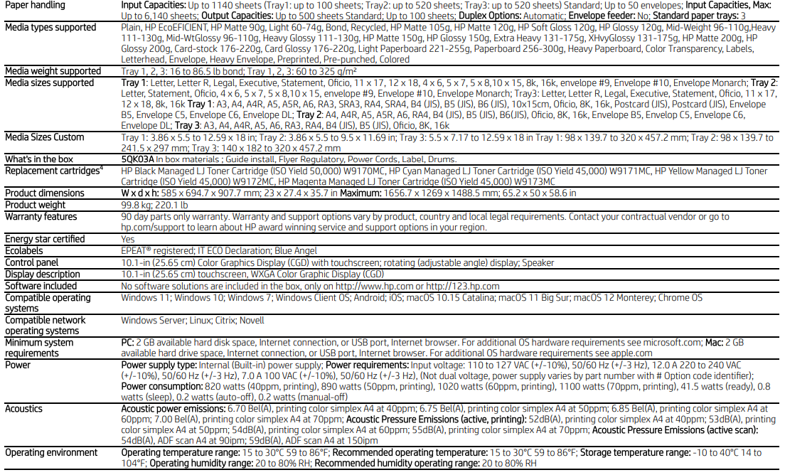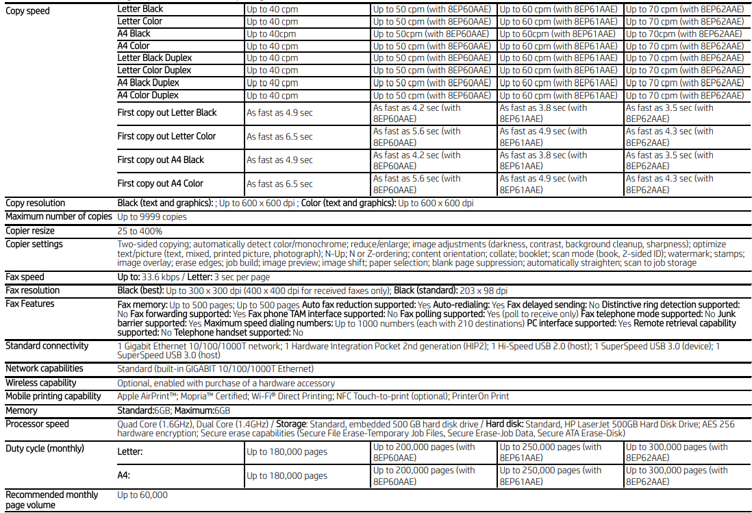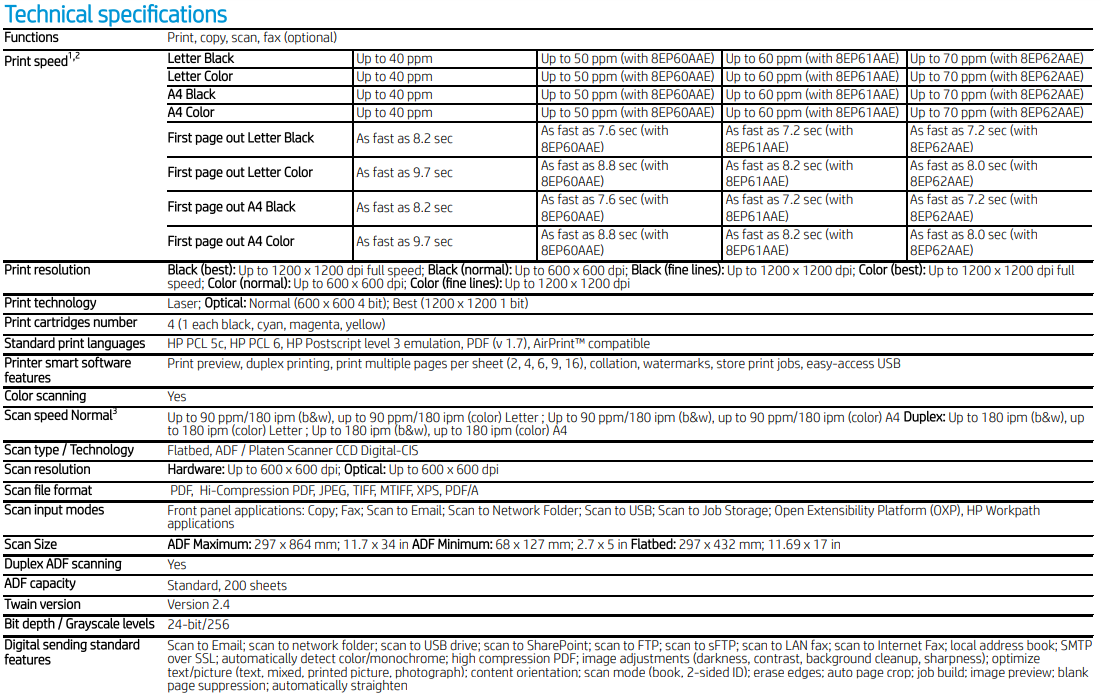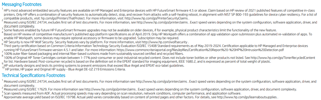 4 Measured using ISO/IEC 24734, excludes First set of test documents. For more information, see hp.com/go/printerclaims . Exact speed varies depending on the system configuration, software application, driver, and document complexity.