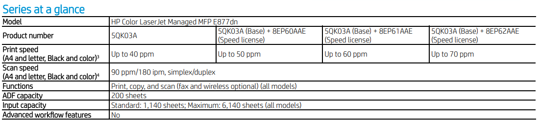 3 The E877 series Flow models include a 300-sheet ADF. The E877 series dn models include a 200-sheet ADF. The ADF on all devices can scan documents up to 11 x 17 inches (A3).