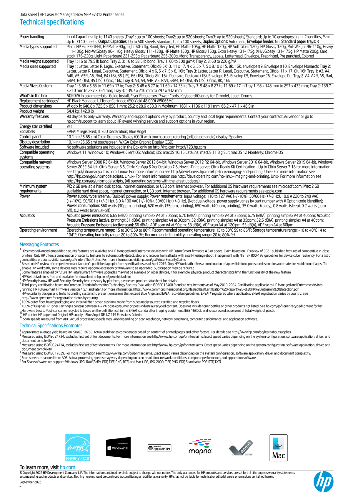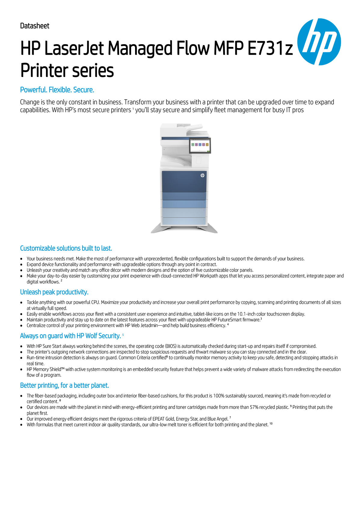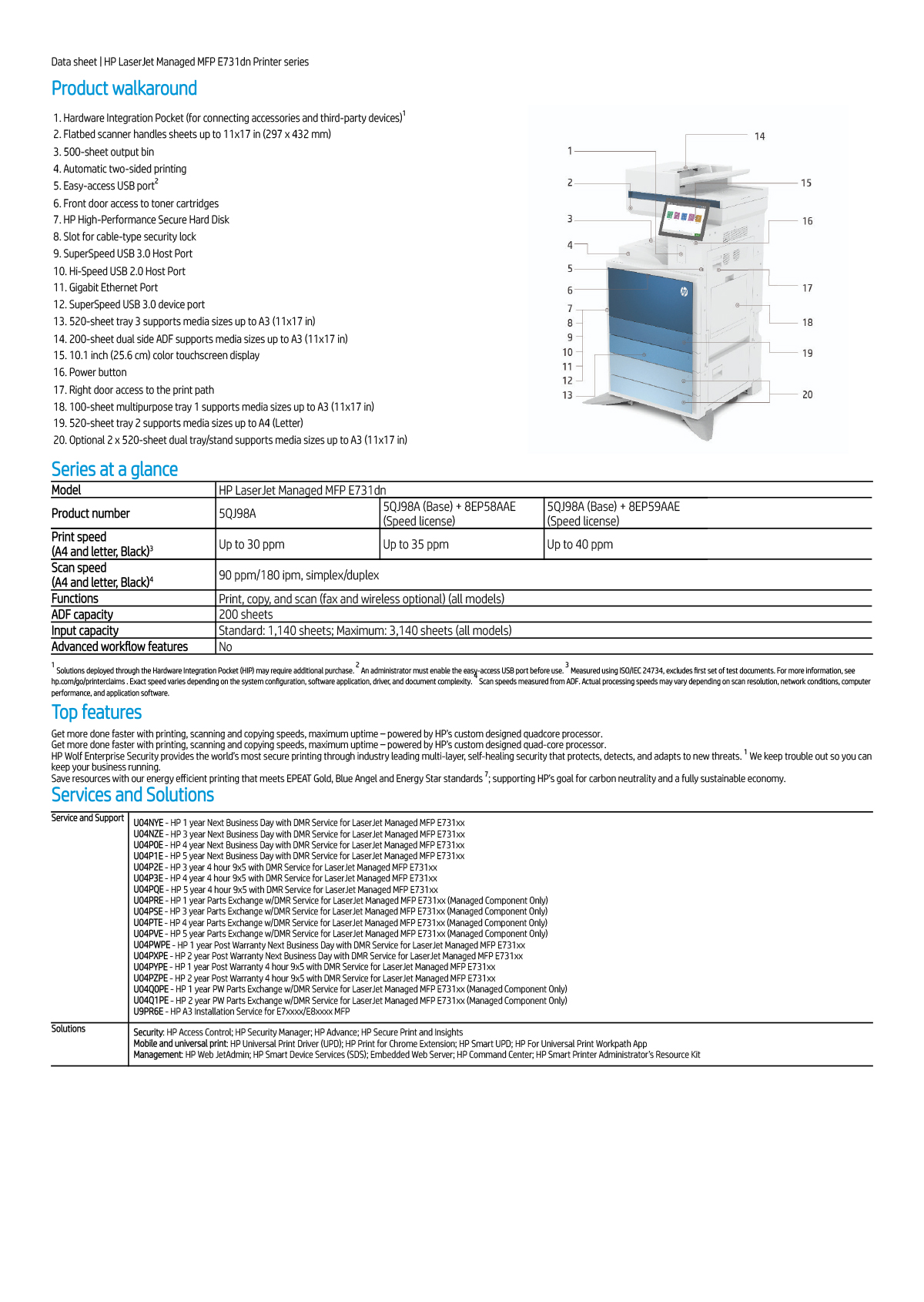 The HP LaserJet Managed MFP E731dn is a secure and efficient A3 black-and-white multifunction printer built for enterprise workflows. It offers fast print speeds, advanced security, and flexible paper handling to keep your business running smoothly at lower cost per page.