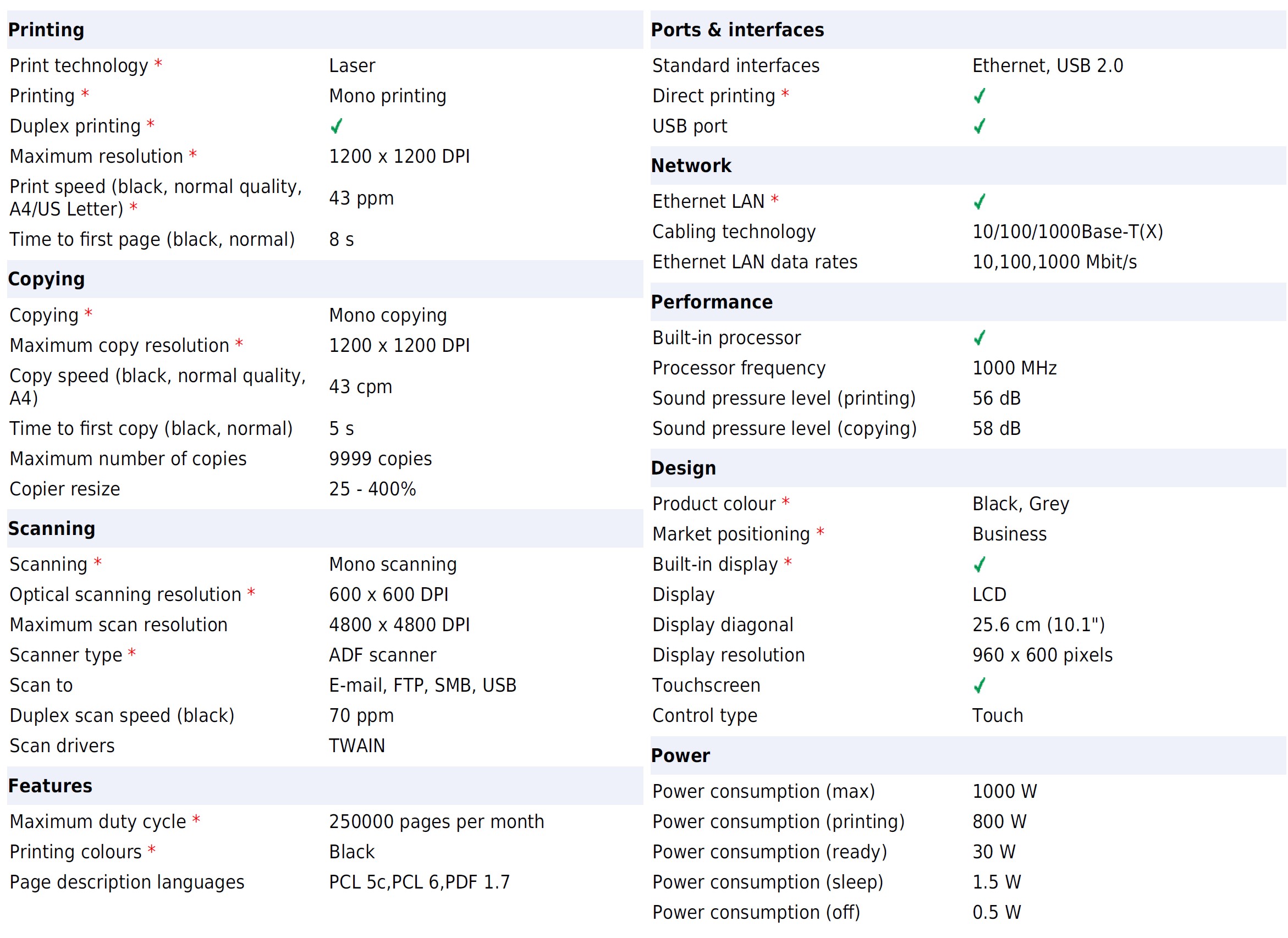 Duplex, Copy: 43 cpm, 1200 x 1200 dpi, Duplex, Scan: 600 x 600 dpi