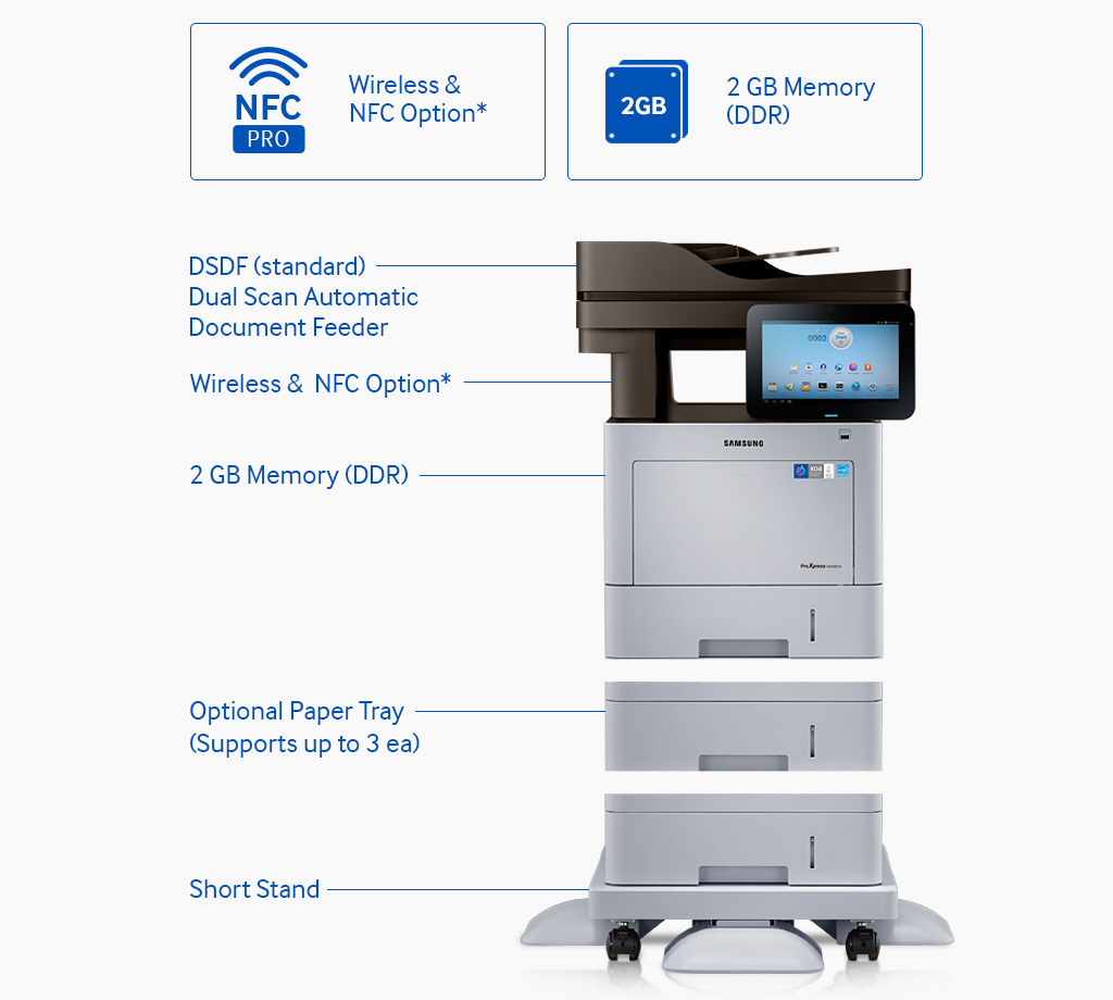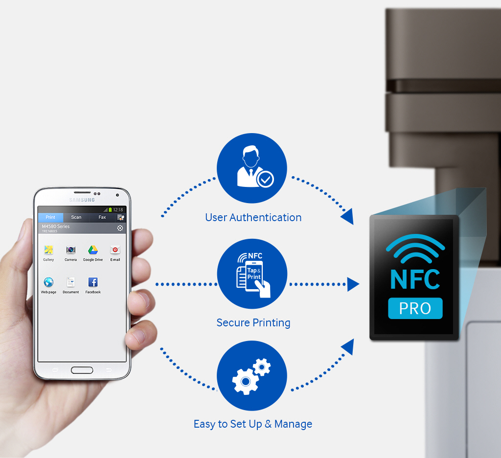With Samsung Wireless & NFC printing, you can simply tap your smart device to access various mobile printing solutions including user authentication, secure printing, easy wireless setup and device cloning.