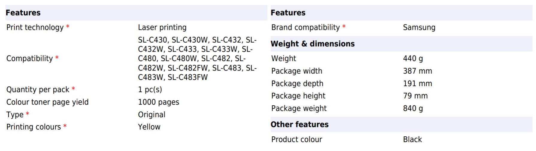Yellow, 1000 Pages, f / Samsung SL-C430W/SL-C480W/SL-C480FW